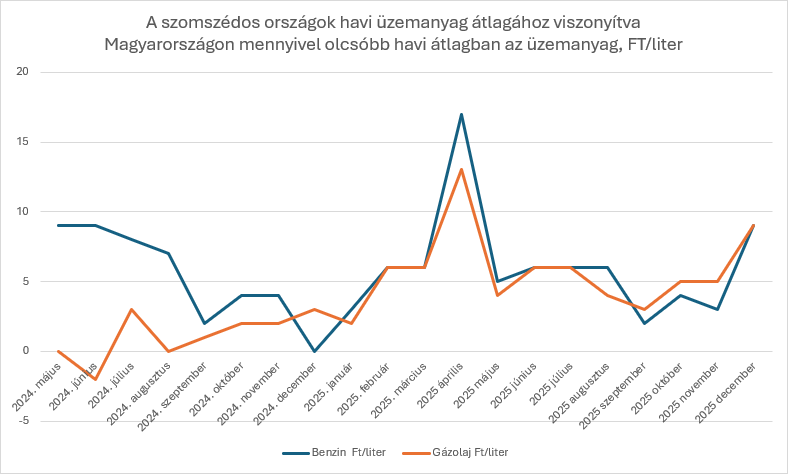 A fenti grafikon azt mutatja meg, hogy a szomszédos országok havi átlagához képest Magyarországon mennyivel olcsóbb a benzin és a gázolaj forintonként literenként 2024 májusától 2025 decemberéig. A pozitív értékek azt jelentik, hogy itthon alacsonyabb az ár, a negatív tartomány pedig azt, hogy időszakosan drágábbak voltunk a régiós átlagnál.