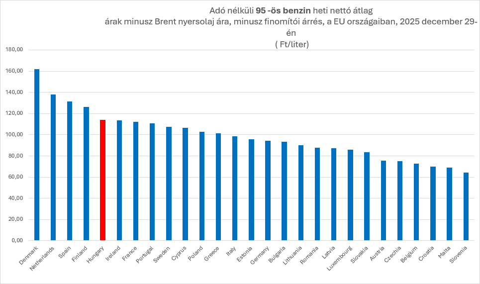 A 95-ös benzin esetében Magyarország adó nélküli, korrigált értéke kb. 114 Ft/liter, amivel: